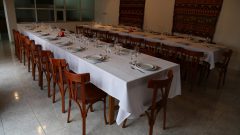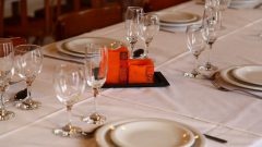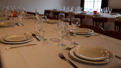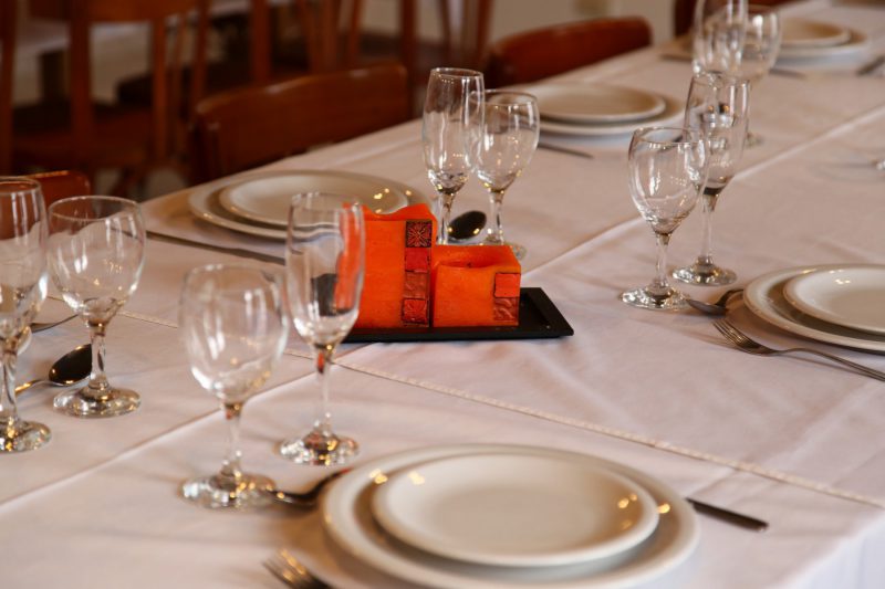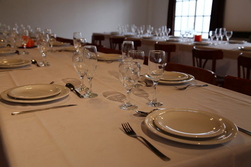 - Vajilla para 40 personas que incluye platos, cubiertos, copas, ensaladeras y manteles blancos.